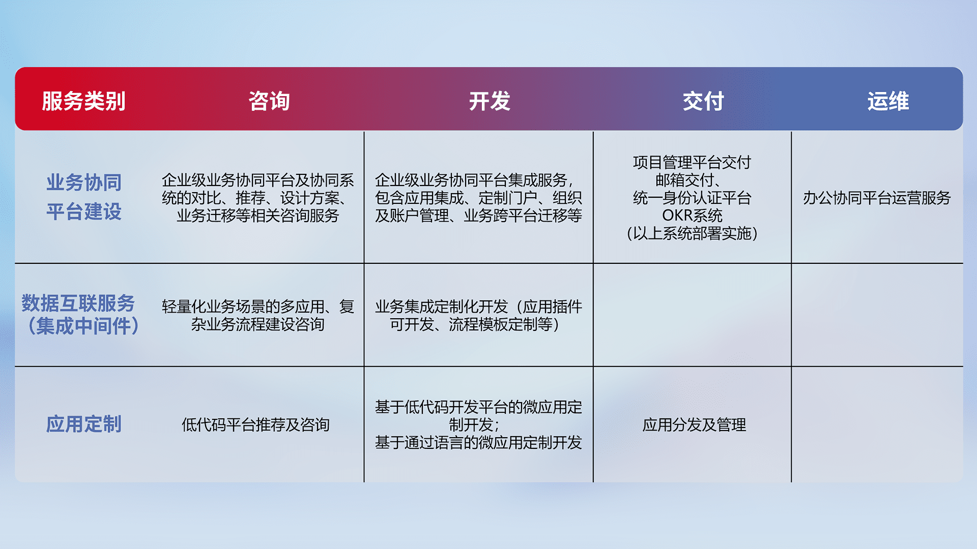 针对钉钉、、、、企微、、、、IDaas等平台级产品提供产品的规划、、、、方案、、、、交付、、、定制化开发等服务,,实现如统一协同办公、、、智能客户服务、、、混合会议管理、、、智能数据查询、、等业务场景,,,,实现数字化转型。。
